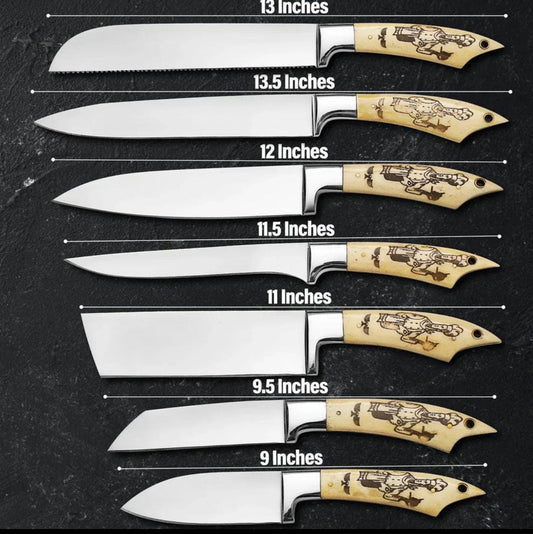 Custom Chef Knife Set with Engraved Bone Handles and Leather Roll Case