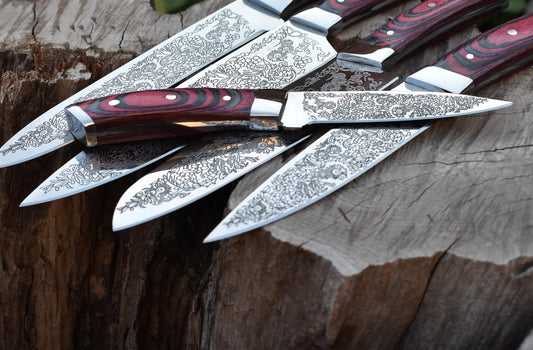 Custom Chef Knife Set with Floral Engraved Blades & Exotic Wood Handles