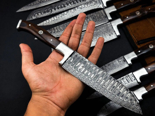 Premium Damascus Steel Chef Knife Set with Dark Rosewood Handle – Full Tang & Leather Roll