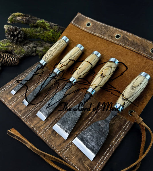 5-Piece Hand-Forged Wood Carving Chisel Set – Leather Wrapped Artisan Tools