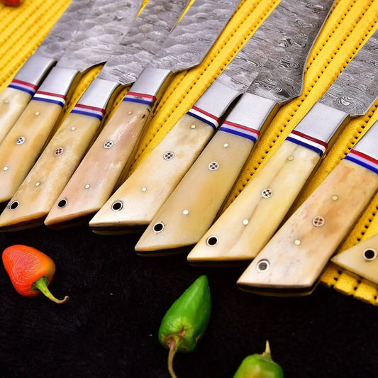 9-Piece Damascus Steel Chef Knife Set with Camel Bone Handle – Full Tang Kitchen Knives