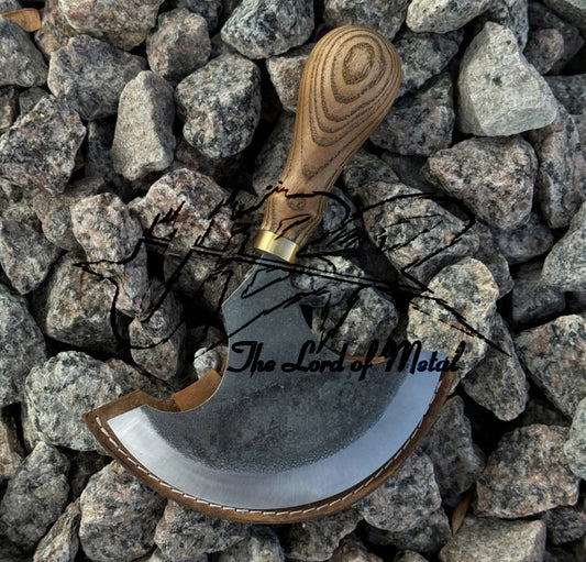 Round Ulu Knife with Wood Handle – Handmade Butcher Chopper with Leather Edge Cover