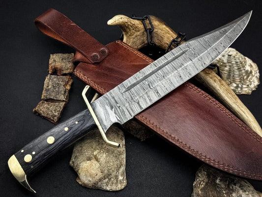 Timber Rattler Bowie Knife – Damascus Steel Bowie Knife with Micarta Handle & Leather Sheath