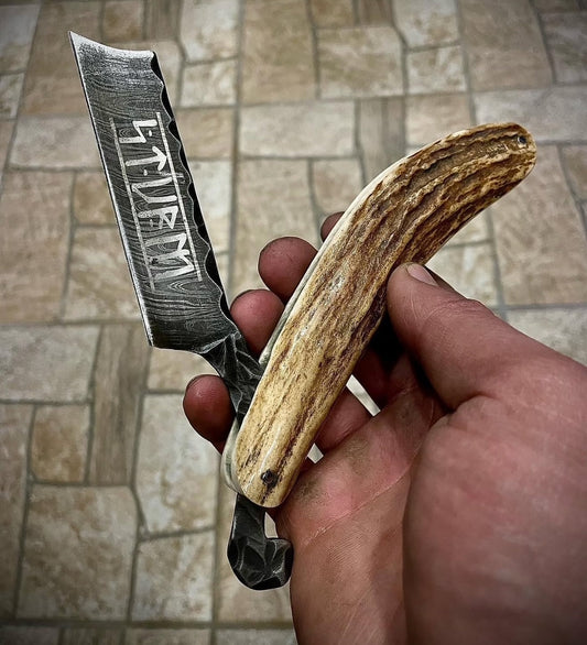 Damascus Steel Straight Razor | Handmade Stag Horn Folding Shaving Razor