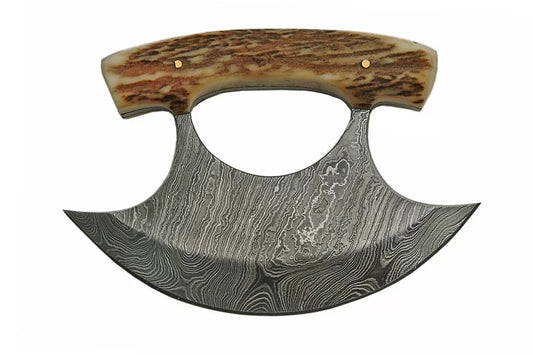Damascus Steel Ulu Knife | Alaskan Ulu | Mezzaluna Stag Horn | Best Gift for Men & Women | Pizza Cutter