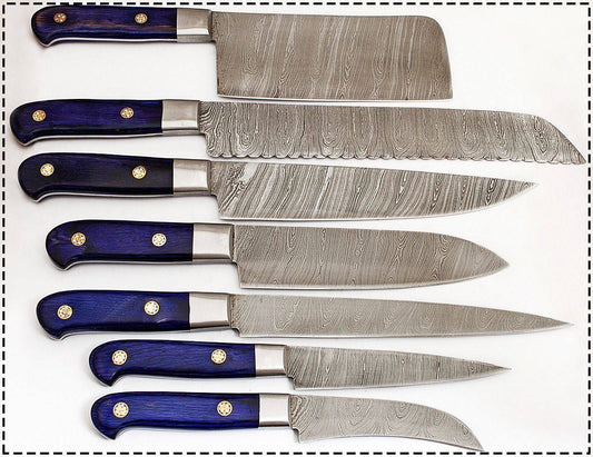 Damascus Steel Professional Knife Set with Blue Dyed Wood Handle – Chef Roll Included