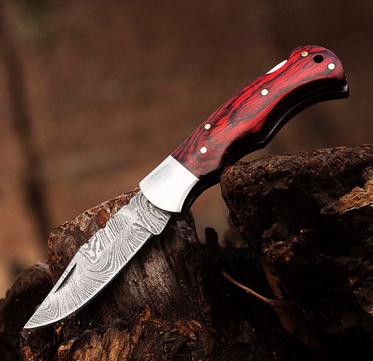 Damascus Folding Knife – Red Wood Handle Pocket Knife