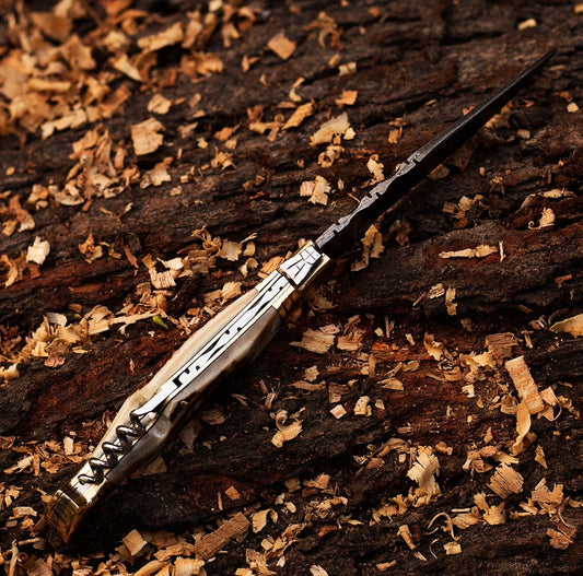 Damascus Pocket Knife – Stag Horn Folding Blade with Corkscrew