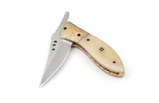 Handmade Folding Knife – Bone Handle & Brass Engraved Bolsters