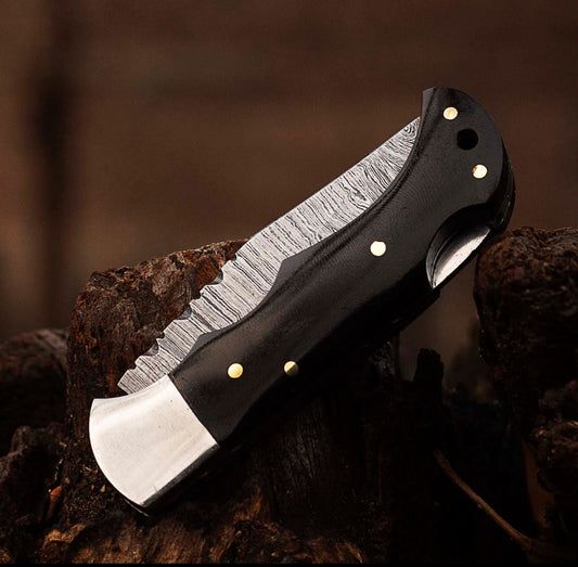Damascus Steel Folding Knife – Black Horn Handle + Leather Sheath