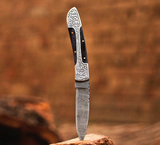 Engraved Damascus Folding Knife – Steel Handle EDC Pocket Knife